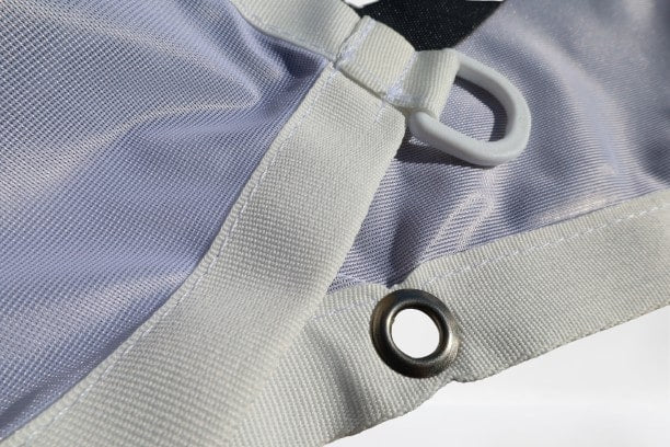 Strong 25mm binding is sewn into all 4 edges of our flags to reinforce them as much as possible. We use an automated eyelet machine to insert eyelets at 50cm intervals and then plastic D-rings are added in each corner to make it easy to hang your flags wherever you need to.